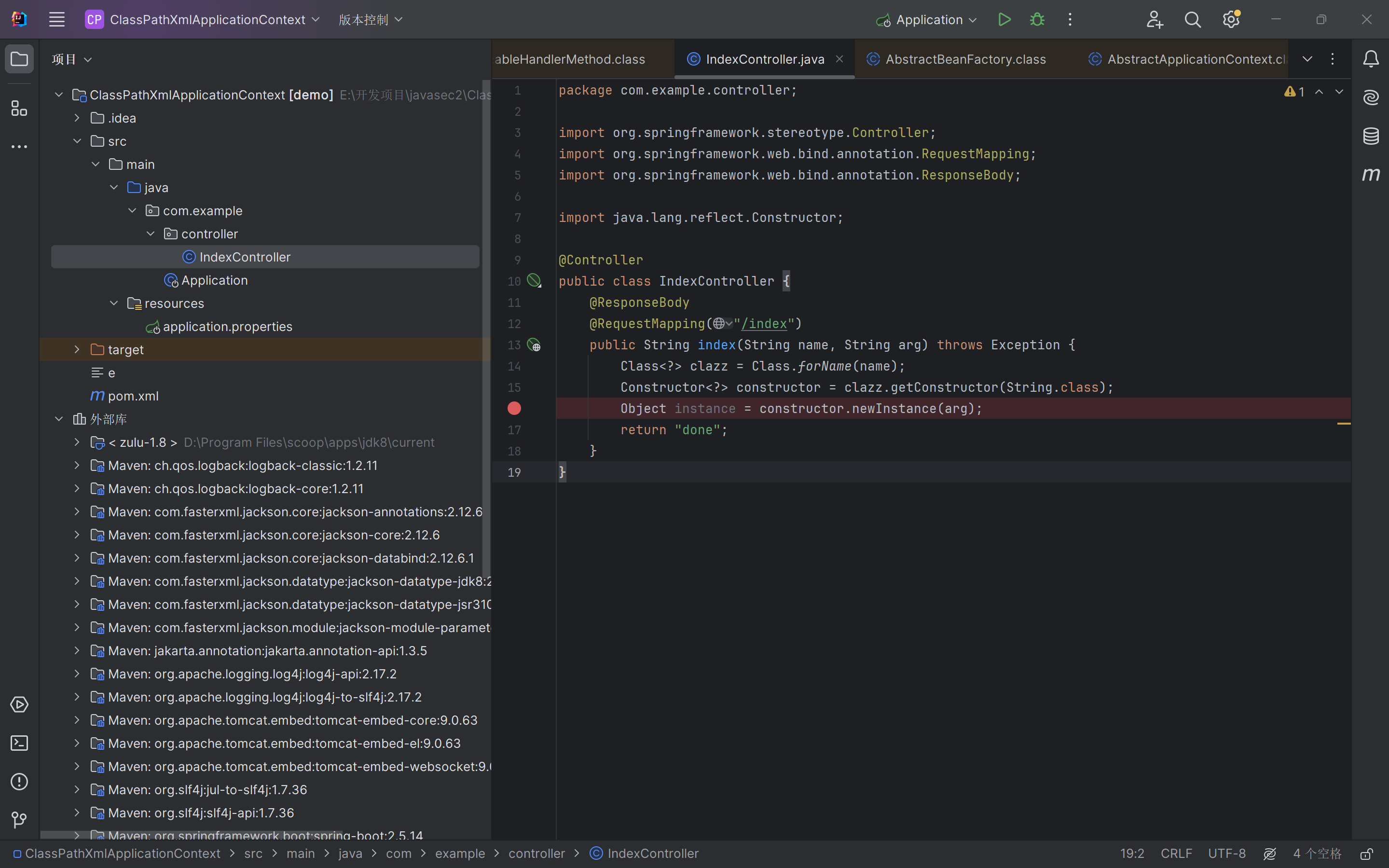 先写一个带有漏洞的类,用来调用ClassPathXmlApplicationContext并启动:
