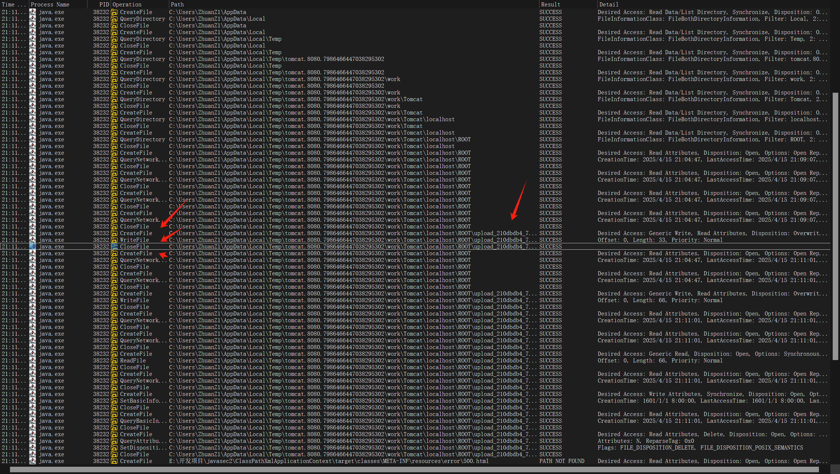 发送修改的数据包,打开Process Monitor,可以看到这个临时文件创建和销毁的过程,说明修改成上传数据包确实存在临时文件。