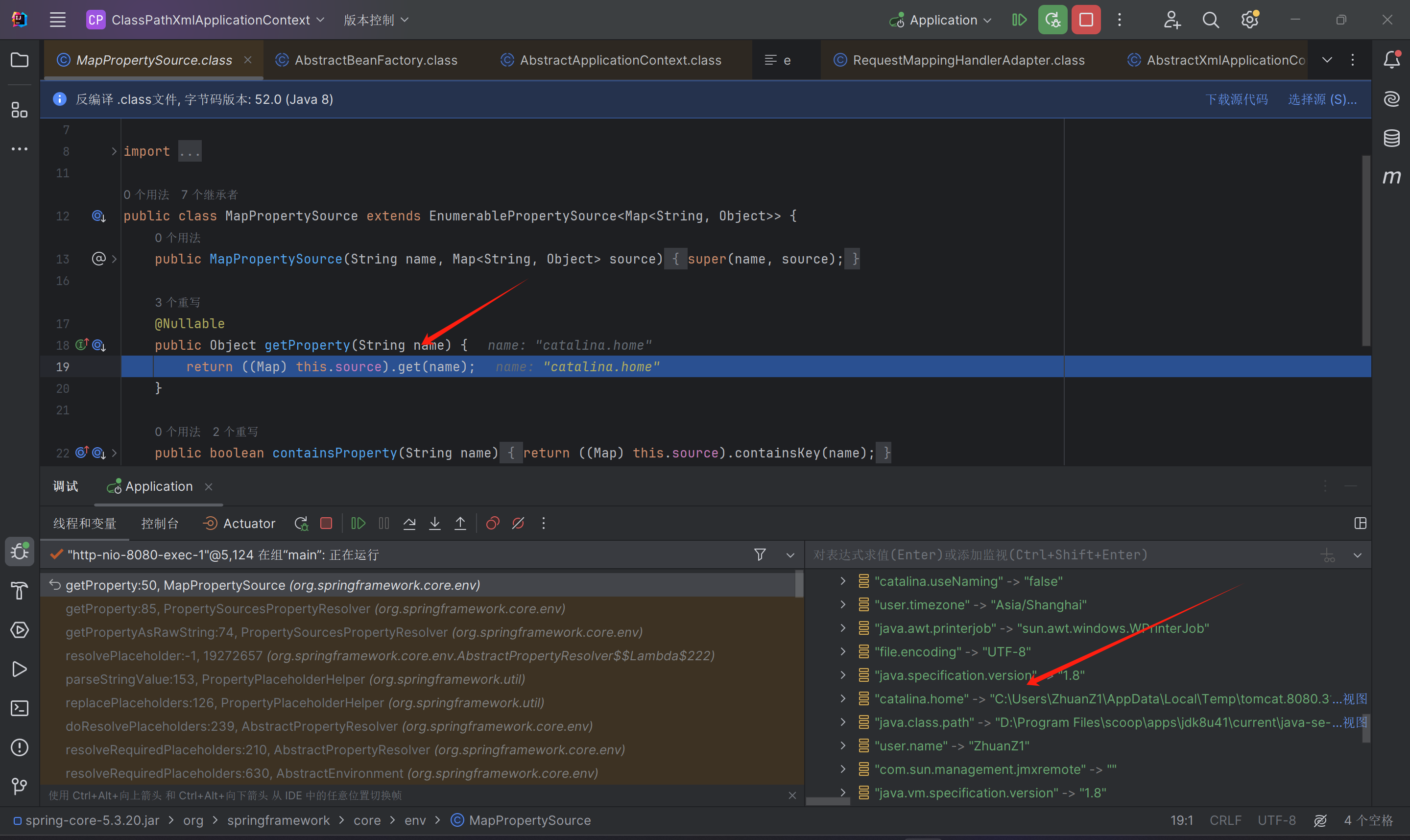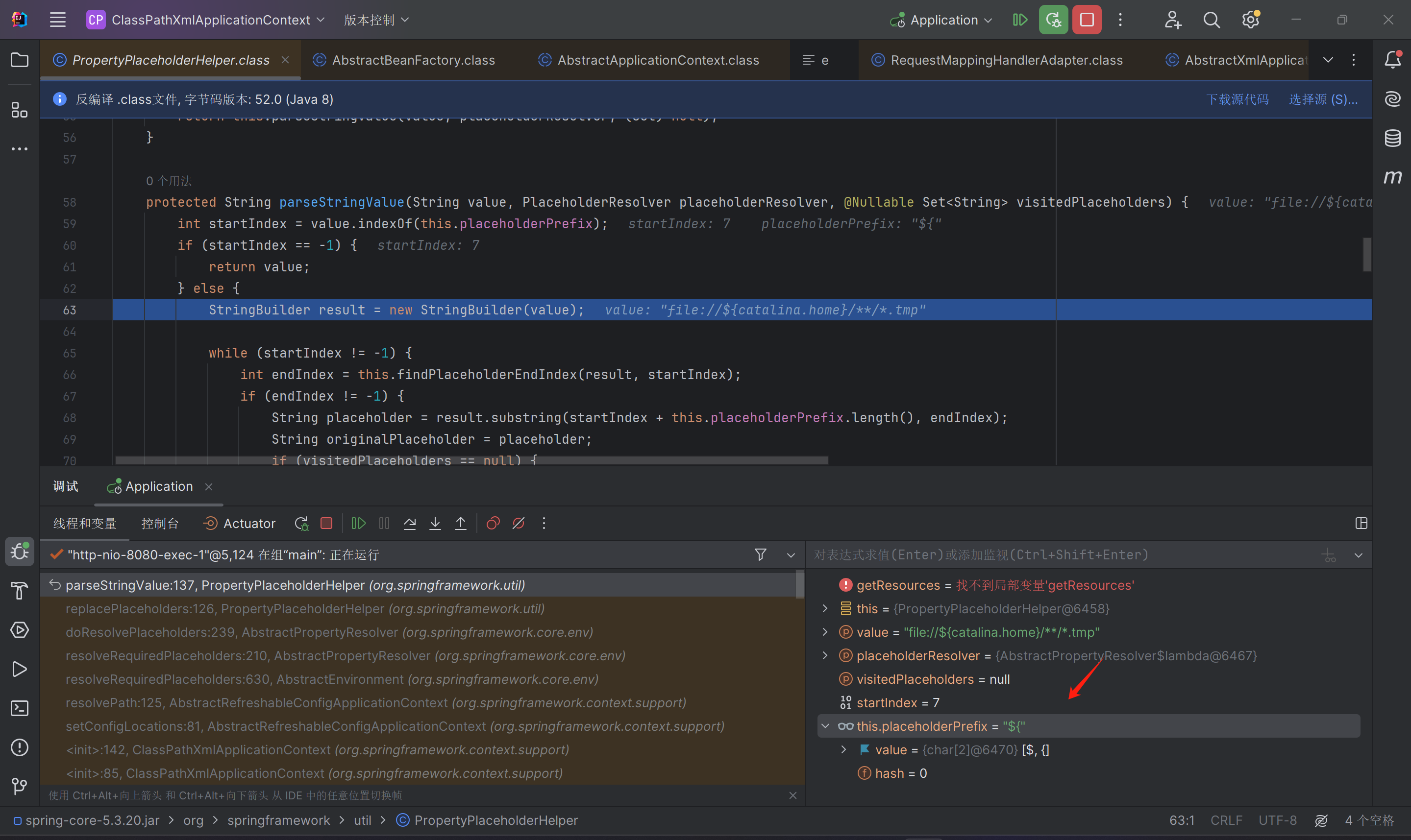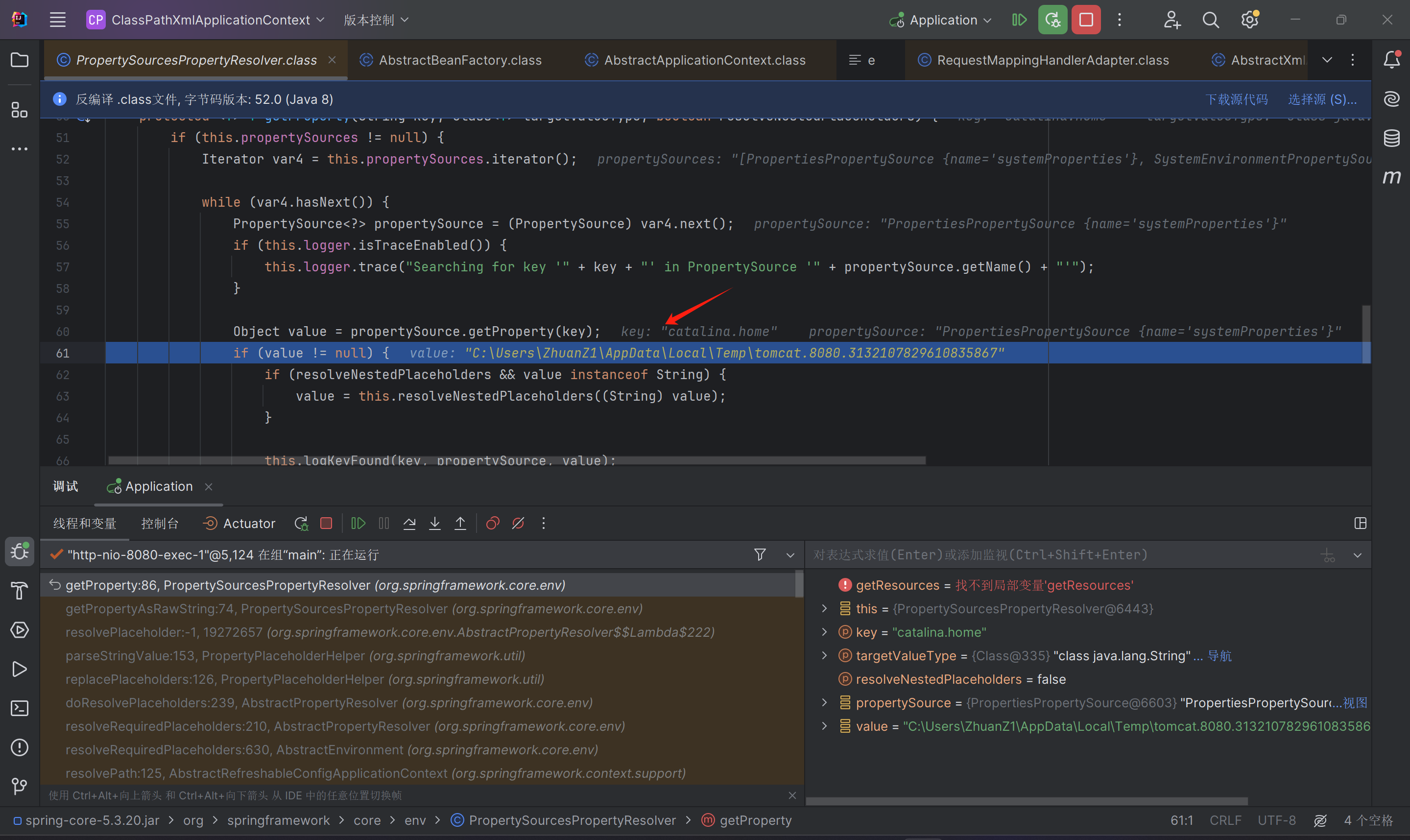 将ClassPathXmlApplicationContext断点后可以发现有环境变量的解析,传入环境变量catalina.home。
