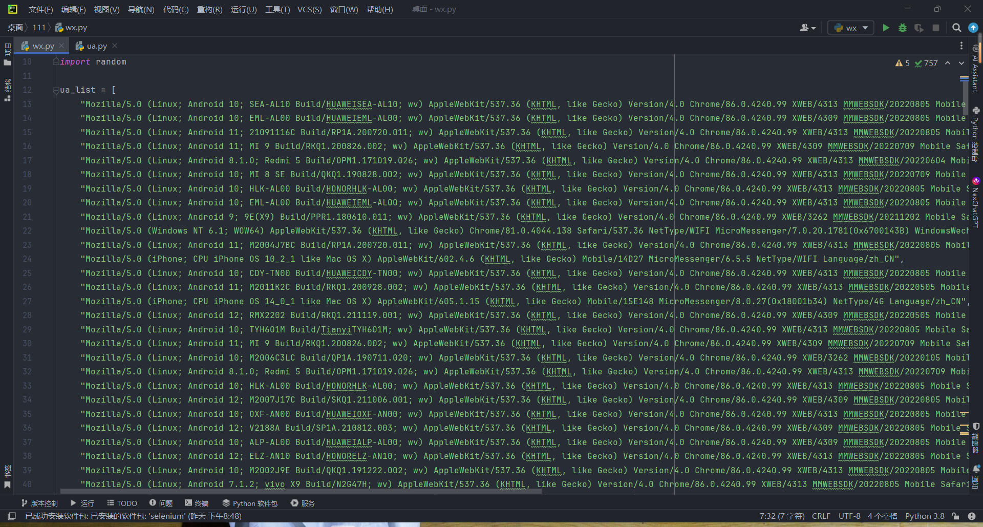 new_ua = random.choice(ua_list) # 使用随机微信 UA
