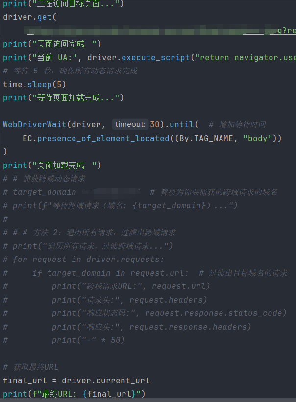 然后我想着用seleniumwire的interceptor替换请求头,在终端打印后显示替换成功,抓包也显示替换成功,但是浏览器f12还是没能替换成功,我都无奈了。然后把下面的这段代码注释了。